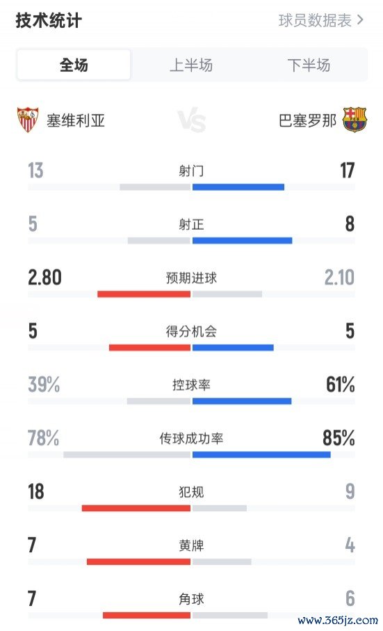 你的位置:足球比赛结果 > 西甲赛事 > 塞维利亚4-1巴萨全场数据:射门13-17,射正5-8,控球率39%-61%