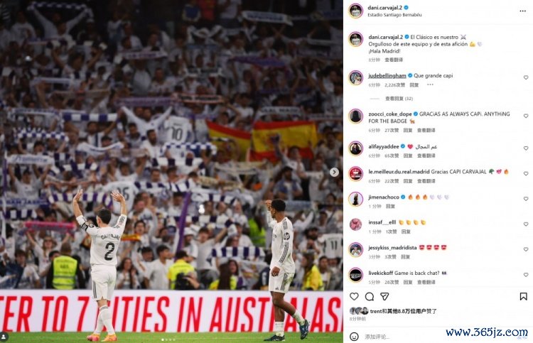 本场比赛卡瓦哈尔替补登场,赛后他也在社媒晒出庆祝得胜像片,配文写说念:“国度德比得胜属于咱们,为这支球队以及这么的球迷感到自爱!皇马加油!”