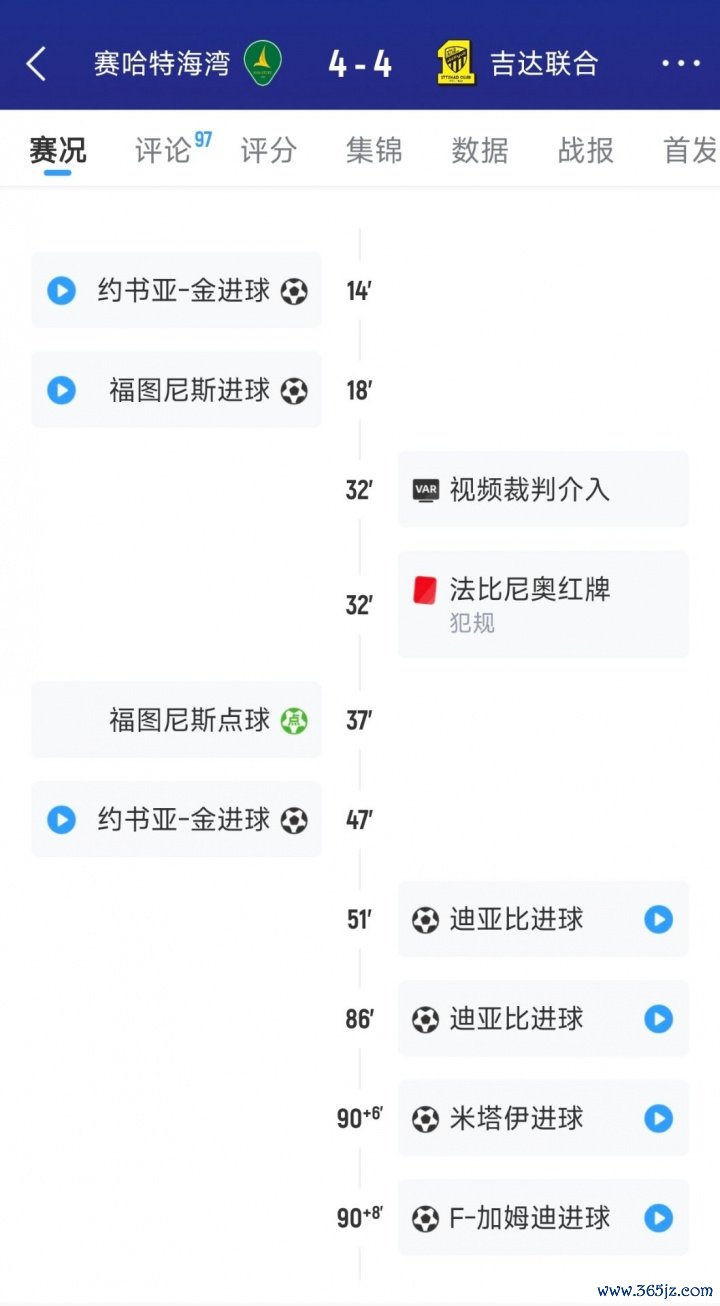 前英超名将迪亚比第51分钟为吉达麇集吹起反击的军号,10东谈主应战的吉达麇集在第86分钟、90+6分钟,90+8分钟连进3球,将比分打平成4-4,完成了惊天的绝平。