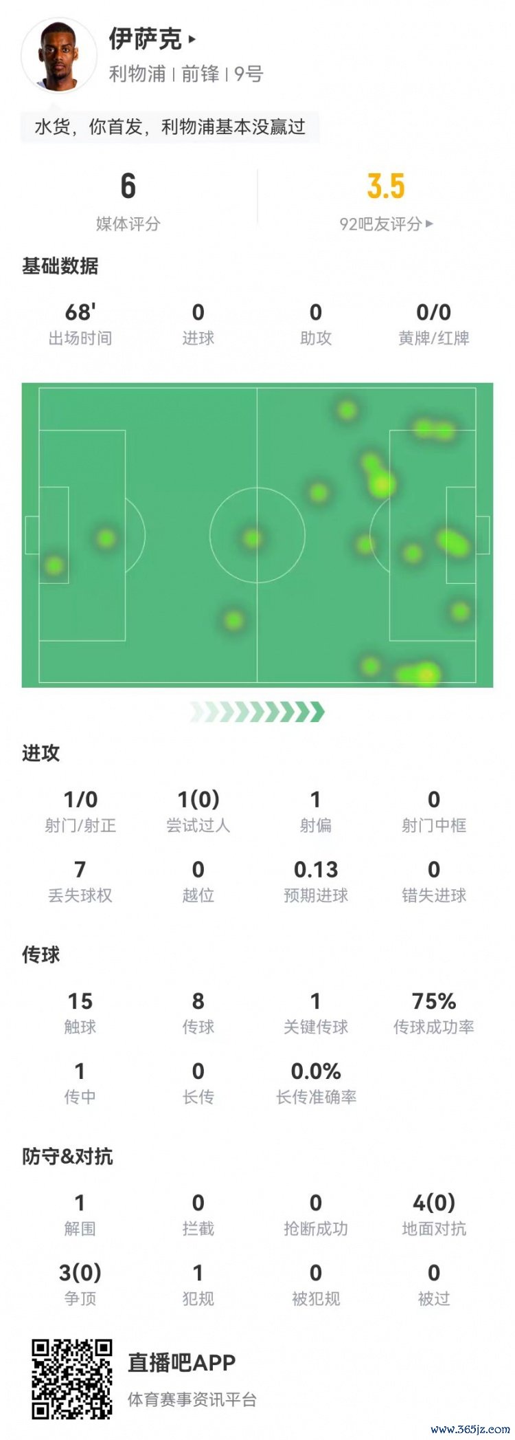 11月23日讯 利物浦在本轮英超0-2过期诺丁汉丛林,伊萨克本场数据如下: