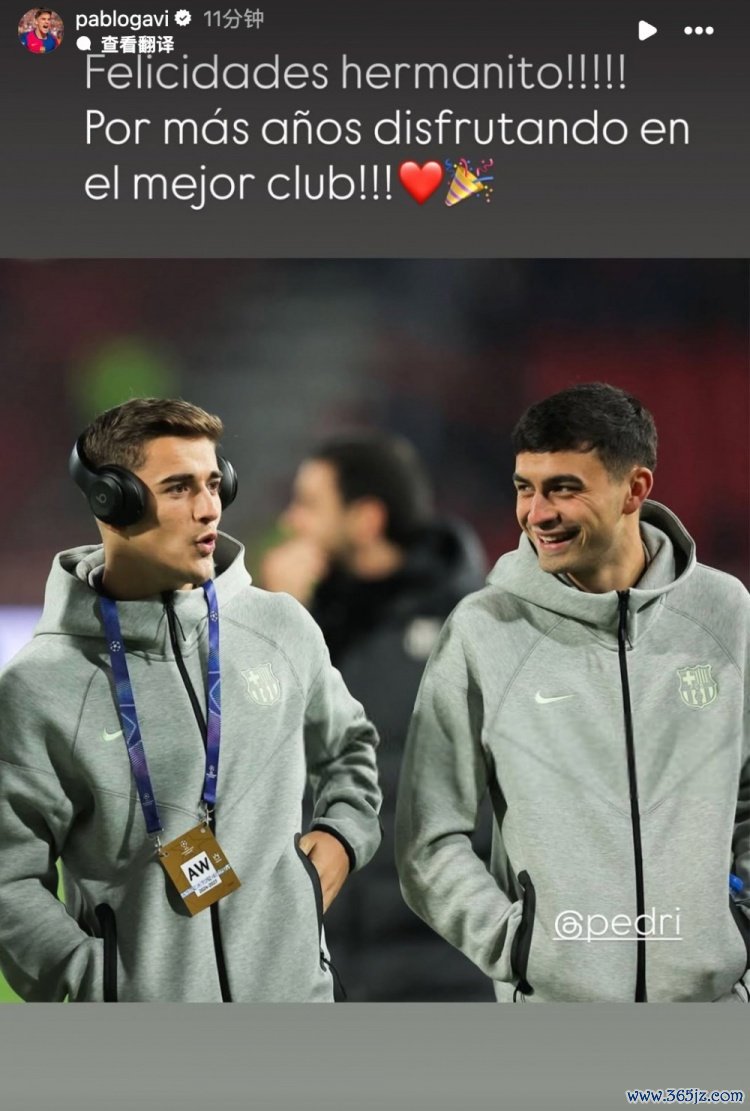 11月25日讯 今天是巴萨中场佩德里的23岁诞辰,他的好昆玉加维通过社媒为其奉上祝颂。