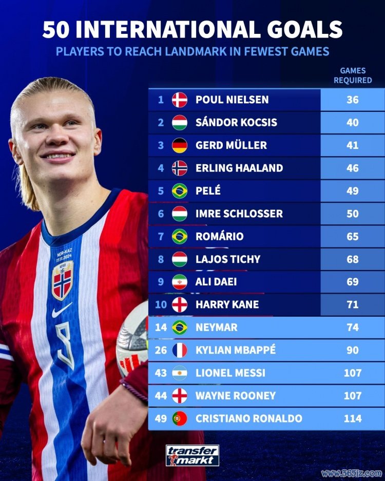 10月13日讯 在上周对阵以色列的世初赛中,哈兰德演出帽子戏法,这让他成为历史上第4快打入国度队第50球的球员。手脚对比,梅西用了107场才达到这一里程碑,而C罗则用了114场。德转列出了完了国度队50球所用场次最少的球员。