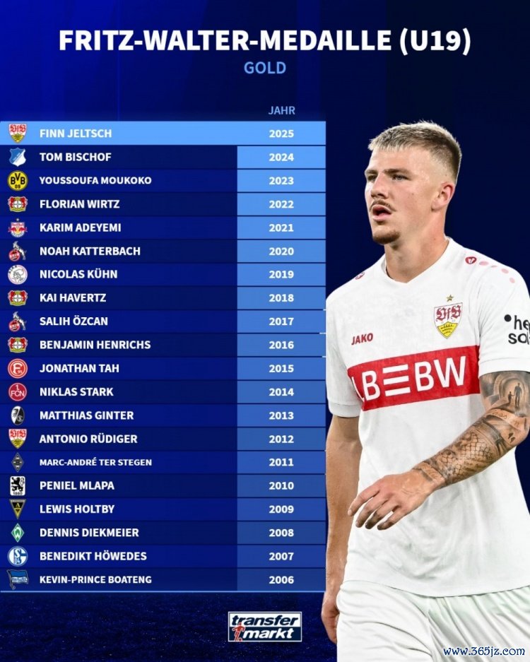 10月17日讯 斯图加特中卫耶尔奇当选德国足协年度最U19最好少壮,德国转会商场列出了往届德国U19年度最好少壮的名单。