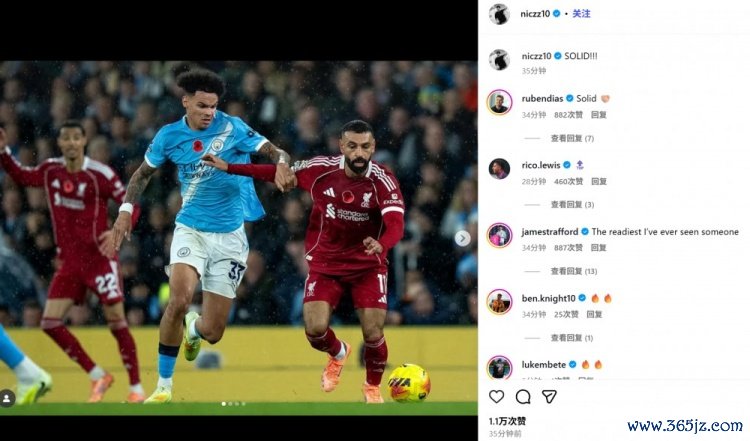 奥赖利也通过社媒晒出我方对位萨拉赫的比赛照,并配文“硬!”抒发我方的雀跃之情。