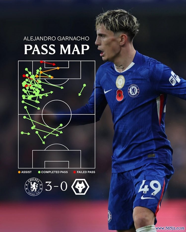 11月10日讯 切尔西在本轮联赛3-0完胜狼队,加纳乔发达拉风送出2次助攻。