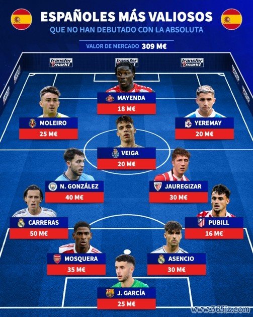 尚未代表西班牙队出场身价最高威望(总价3.09亿欧)