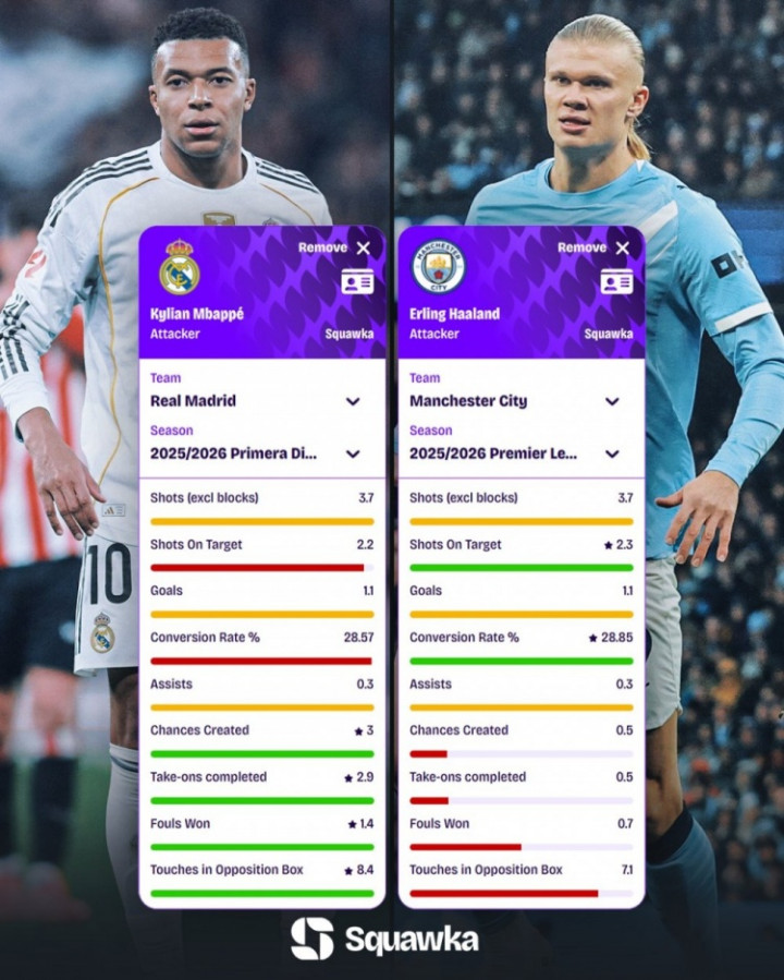 直播吧12月10日讯皇马行将迎来与曼城的欧冠焦点战,姆巴佩对垒哈兰德成为一大看点(前者未笃定能否登场)。赛前,Squawka清点了两名球员本赛季在各自联赛中的场均数据。