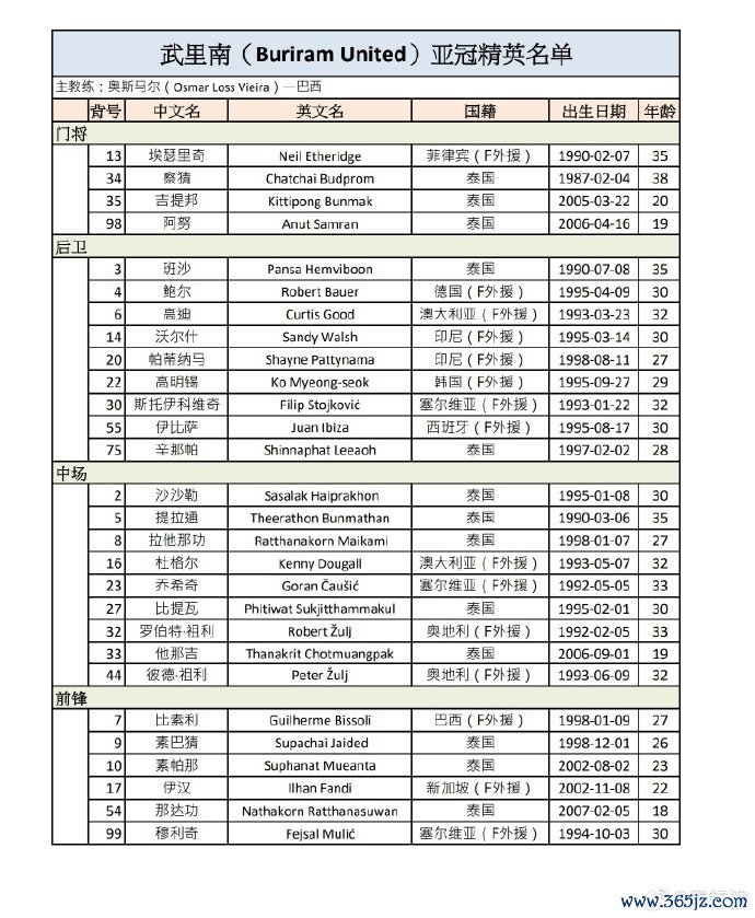 9月15日讯 新赛季亚冠精英联赛行将打响,武里南联公布28东谈主参赛名单,球队共有15位外助,前亚泰球员彼得-祖伊在列。小组赛阶段,武里南联与海港、蓉城、申花三支中超球队王人将有交手。