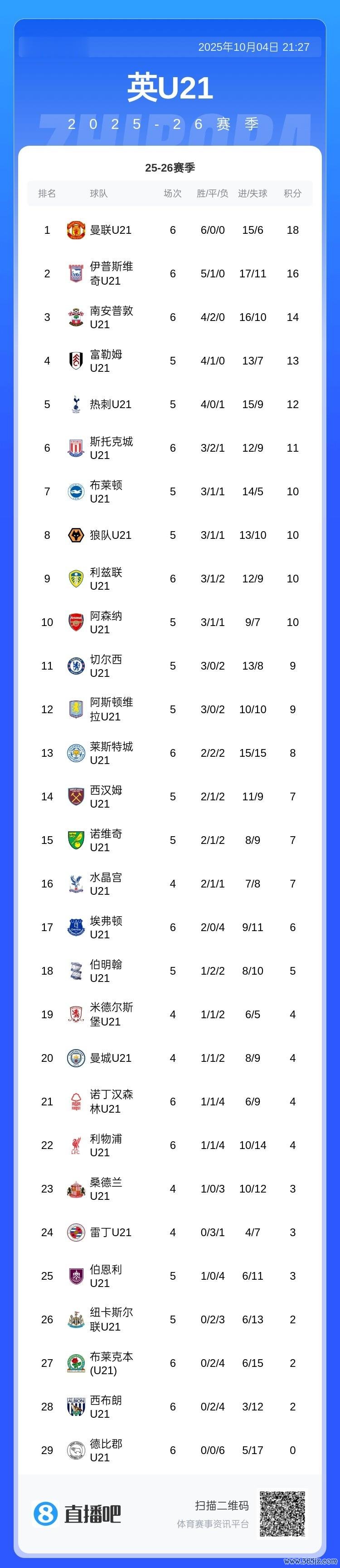 直播吧10月4日讯英超U21联赛第6轮,曼联U21队2-1打败埃弗顿U21队。红魔后生军本赛季于今联赛6战保抓全胜,领跑积分榜。