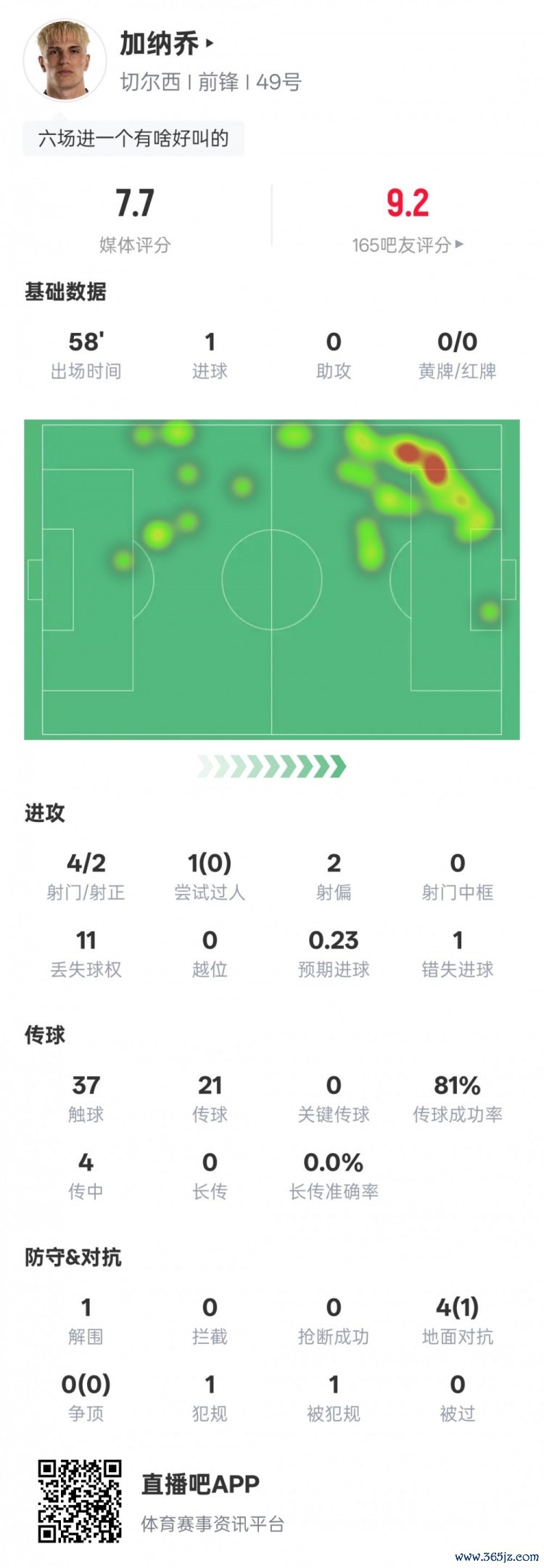 10月25日讯 2025-26赛季英超联赛第9轮,切尔西主场迎战桑德兰。加纳乔首发出战,3射门2射正1i进球,还有1次错失进球契机,评分7.7。