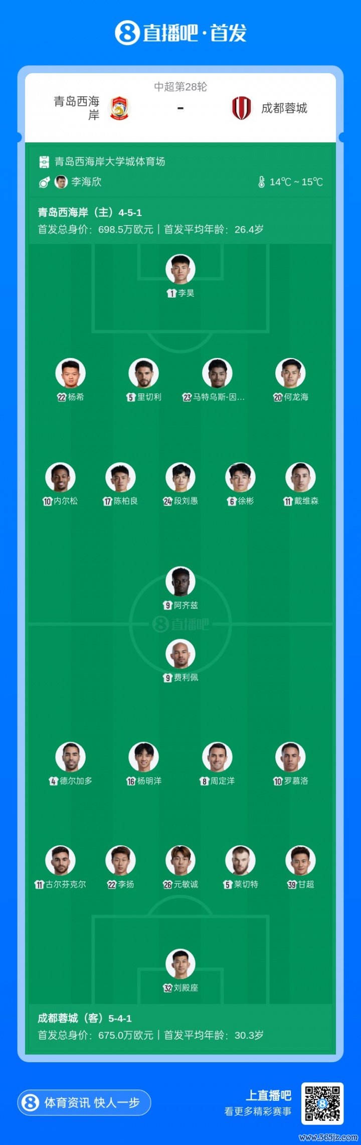 10月26日讯 北京时代今晚18点30分,中超第28轮,青岛西海岸主场迎战成都蓉城,赛前两边公布首发声势。当今成都蓉城少赛一场过期榜首海港2分,唯有本场比赛取胜,就能登上中超榜首。