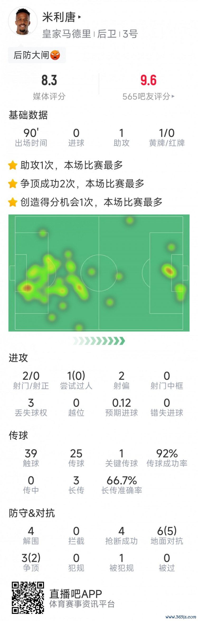 10月27日讯 在本轮西甲,皇马2-1打败巴萨,以下为米利唐本场数据: