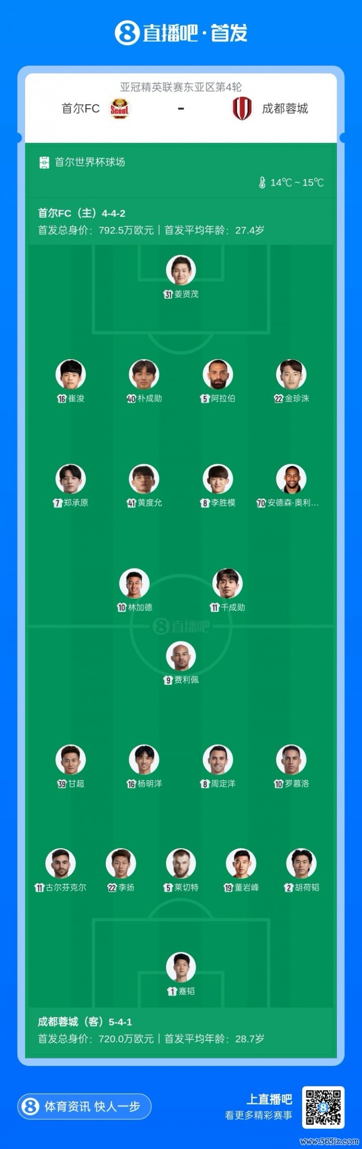 本轮赛前,成皆蓉城1胜0平2负积3分名次东亚区第9,处于晋级区外;首尔FC则是1胜1平1负积4分位列第6。蓉城近期各项赛事3轮不堪。