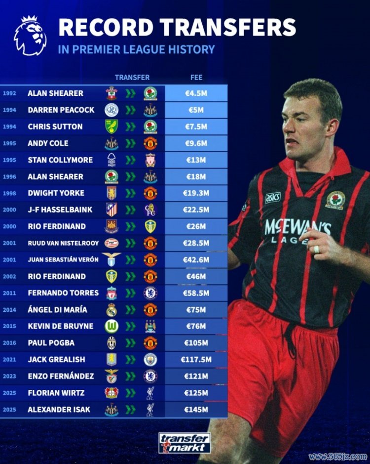 11月6日讯 德转列英超历史转会费记录变化,1992年阿兰-希勒450万欧转会布莱克本成为首个标王,现在伊萨克加盟利物浦1.45亿欧最贵。