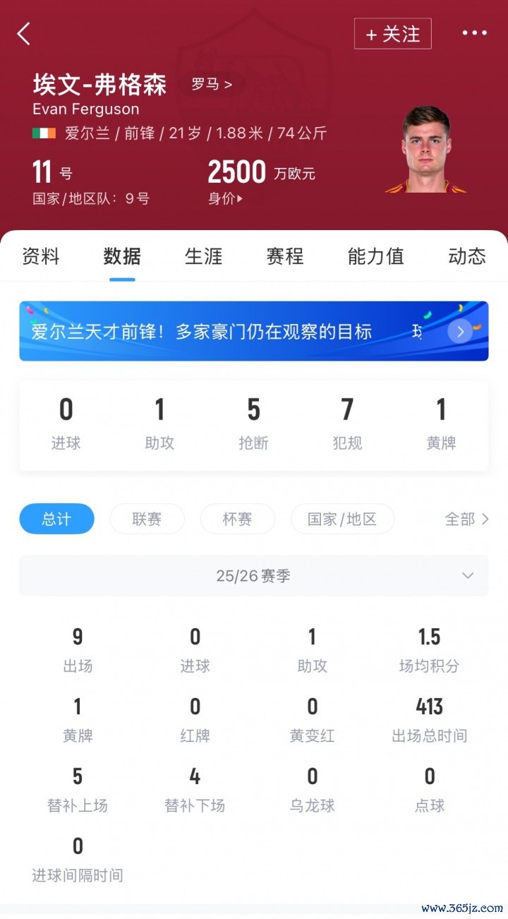 而在之后弗格森情状下滑,且遇到重伤,在西汉姆联也没能找回情状,今夏租出加盟罗马后,现在出场9次4次首发,以为出场413分钟仅收货1次助攻,没能打入进球。
