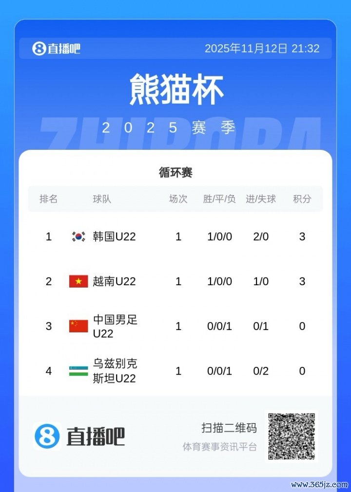 11月12日讯 熊猫杯首轮,U22韩国2-0乌兹别克U22,U22国足0-1不敌越南U22。本轮事后,韩国U22暂列小组第一,国足U22位列第3。