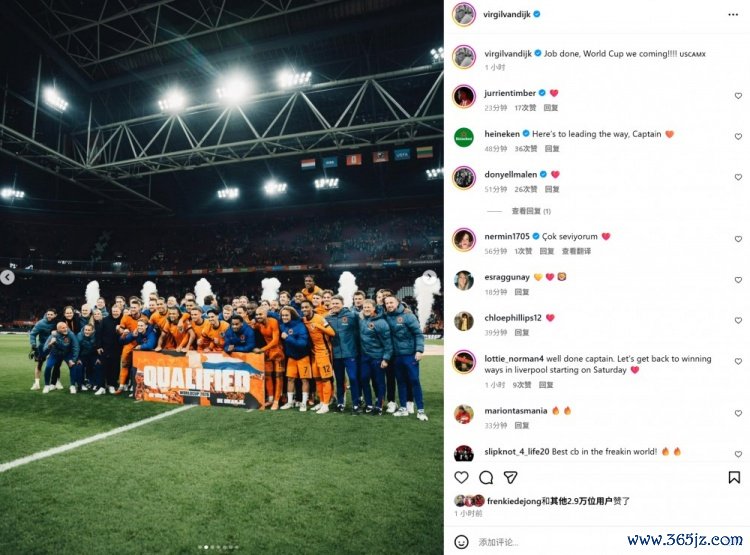 队长范戴克也在社媒晒出全队庆祝晋级的合影,配文写说念:“任务完成,全国杯咱们来了!”