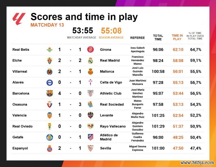 11月25日讯 Opta统计了西甲第13轮比赛的净比赛技术,本轮场均净比赛技术为53分钟55秒,而本赛季西甲场均净比赛技术为55分钟8秒。