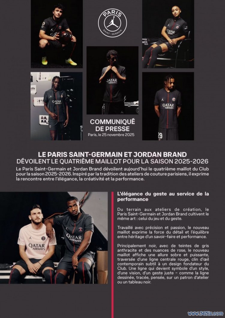 11月25日讯 官方音信,巴黎与乔丹品牌至本日公布了俱乐部2025-26赛季的第四款球衣。其蓄意灵感源自巴黎时装工坊的传统,阐明了优雅、创意与性能的和会。
