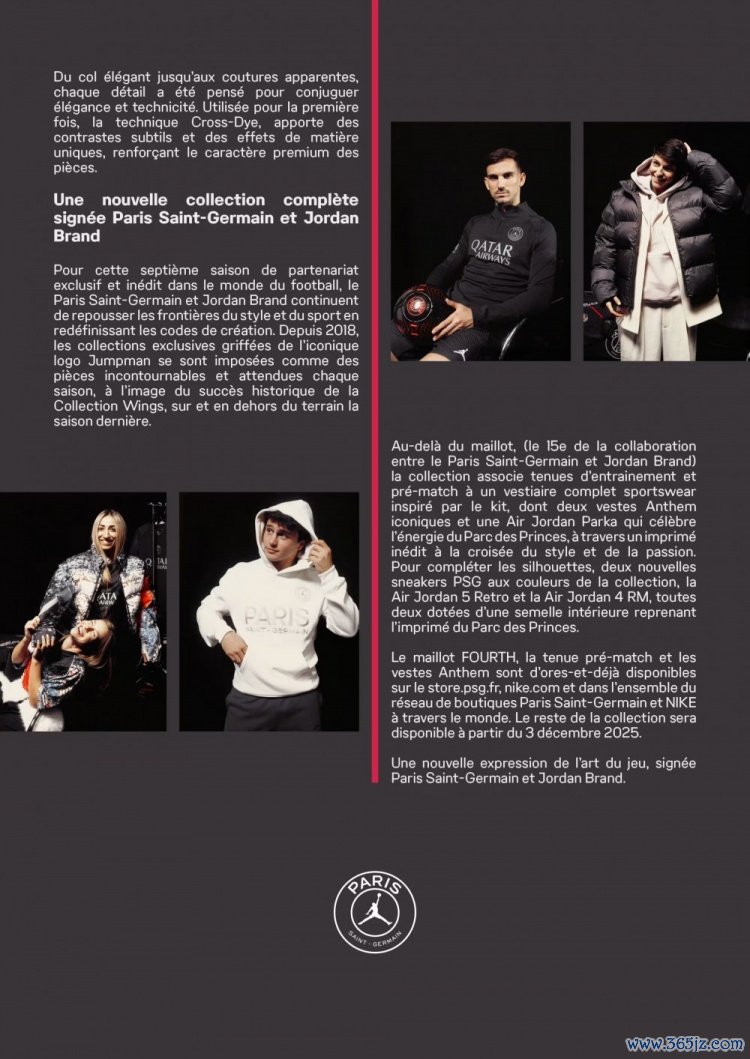 除球衣(这是巴黎与乔丹品牌协作的第15款球衣)除外,该系列还将视察服与赛前着装,同受比赛服启发的无缺通顺生计衣饰相都集。其中包括两款标志性的Anthem夹克,以及一件以独到印花和会作风与情感、旨在赞誉王子公园球场活力的Air Jordan派克大衣。为完义举座造型,系列还推出两款以该系列配色为主题的新款巴黎通顺鞋:Air Jordan 5 Retro和Air Jordan 4 RM,二者均配备印有王子公园球场图案的鞋垫。