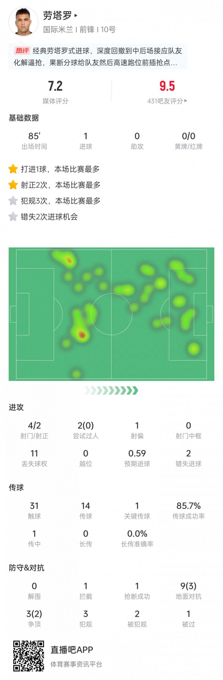 此役劳塔罗为国米首发出战,打进一球,他当选本场比赛国米队内最好球员。
