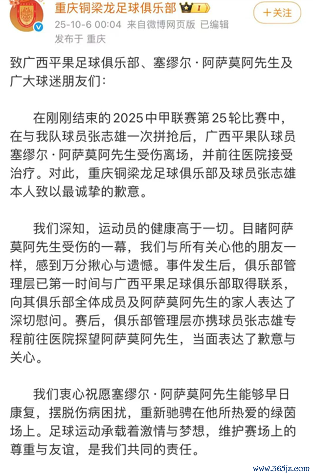 而重庆铜梁龙方面,俱乐部在6日凌晨通过微博发文致歉,将张志雄与阿萨莫阿的碰撞定性为“一次拼抢”,并暗示俱乐部处置层已第一时分与广西平果获得关联,抒发慰问并视察了阿萨莫阿。