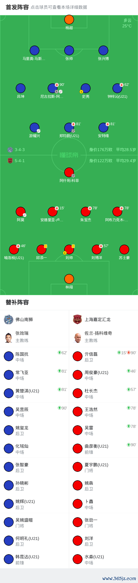 北京时代10月25日中国足球甲级联赛 联赛 第28轮,佛山南狮主场对阵上海嘉定汇龙。佛山南狮郑钧蔚破门,尼古拉斯-阿巴拉辛破门。上海嘉定汇龙阿什利-科菲破门。最终比分佛山南狮 2-1 上海嘉定汇龙。