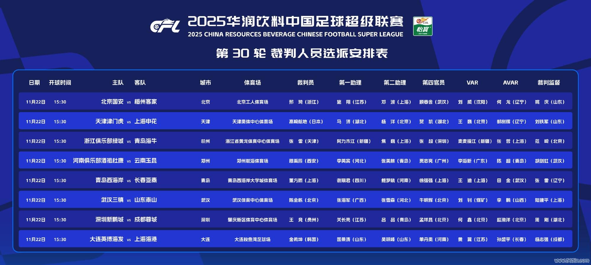 北京时辰11月22日,中超联赛第30轮8场比赛将至今世界午同期开打。刚刚,本场比赛裁判遴派效果出炉,2场争冠要道战均由外籍裁判握哨,原土裁判则吹罚保级大战。